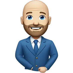 blue-eyed smiling bald man with a beard in a blue suit emoji