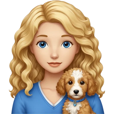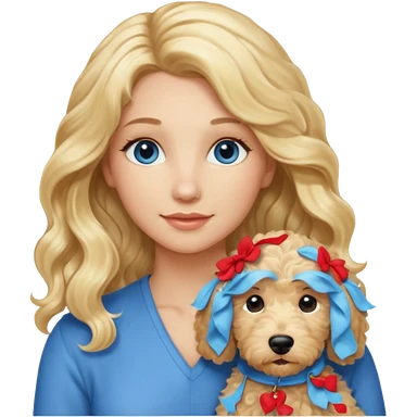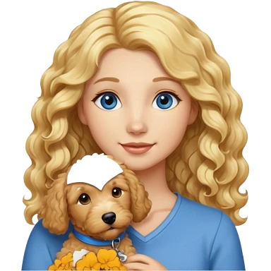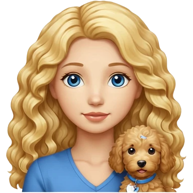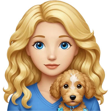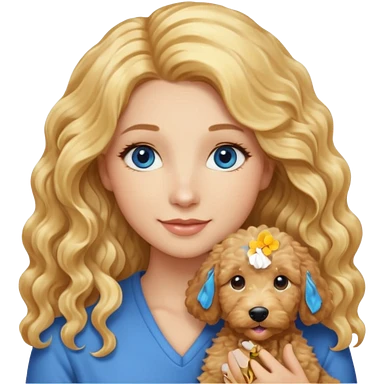 Long blonde hair, blue eyed woman with wavy blond goldendoodle emoji