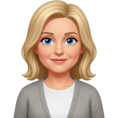 Blue eyes, fair skin, longer blonde hair, medium height, medium frame, middle aged women, cardigan, grey top emoji
