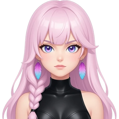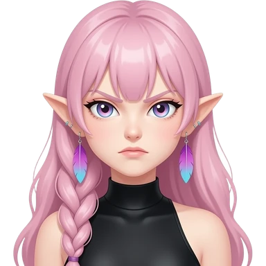 Gorgeous anime lady long-pale-pastel-pink-hair with one braid on each side, grumpy expression, purple-pink feather-ear-cuffs in hair, black bodysuit, blue eyes, pink iris, ethereal, fashion aesthetic, colorful emoji