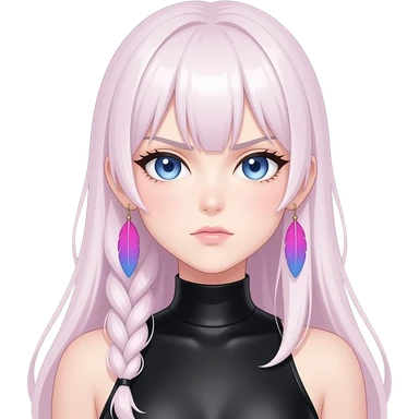 Gorgeous beautiful pretty grumpy anime lady long-pale-whitish-pastel-pink-hair with one braid on each side, hanging gradient-purple-pink feather-ear-cuffs on each side in hair, black bodysuit covering neck, blue eyes, pink iris, ethereal, fashion aesthetic emoji
