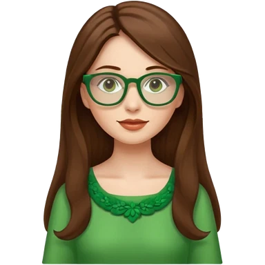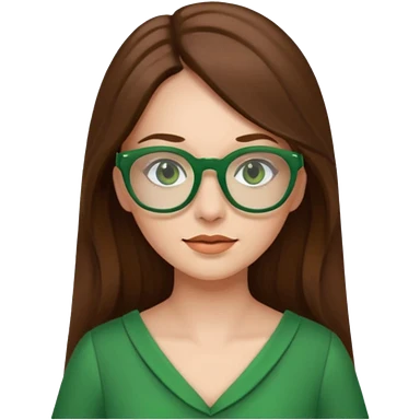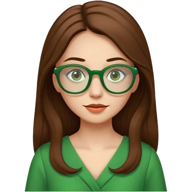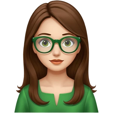 dark red log haired white woman with glasses and green eyes behind a computer dressed casually emoji