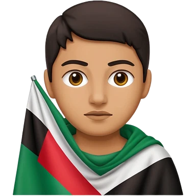 a young boy waving the palestine flag up high he is wearing a black jacket with blue jeans and black hair emoji