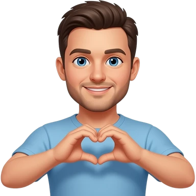 Short hair guy with short beard with blue eyes and hands doing a heart emoji