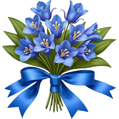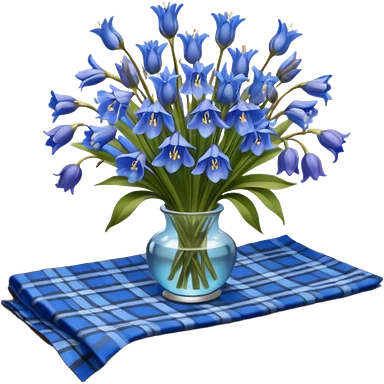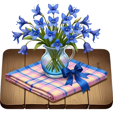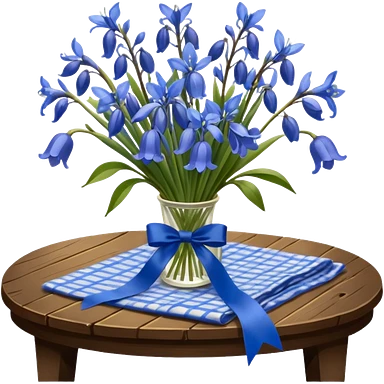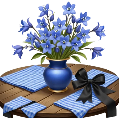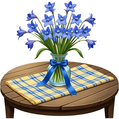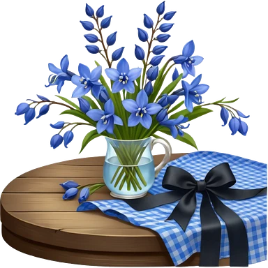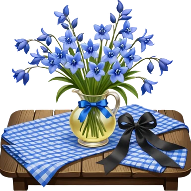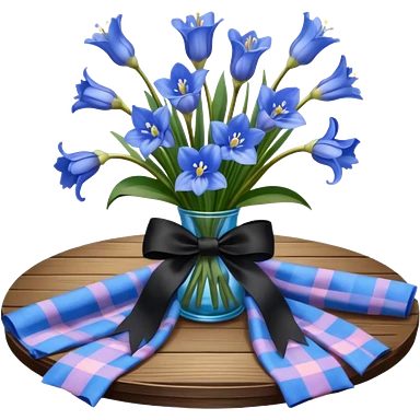 A lush bouquet of bright blue color bluebell black satin ribbon, resting on an antique wooden table, with a pale yellow and pink plaid pattern table cloth emoji