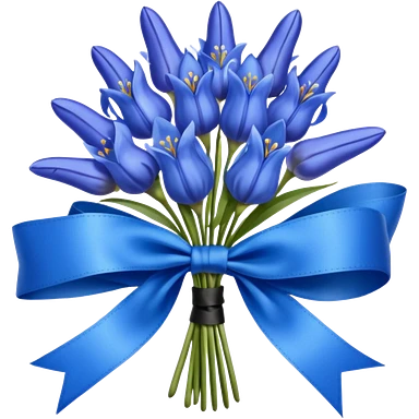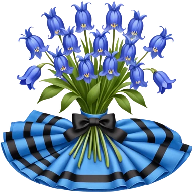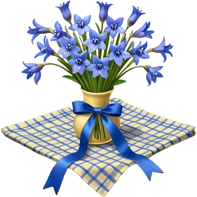 A lush bouquet of bright blue color bluebell black satin ribbon, , with a pale yellow and pink plaid pattern table cloth emoji