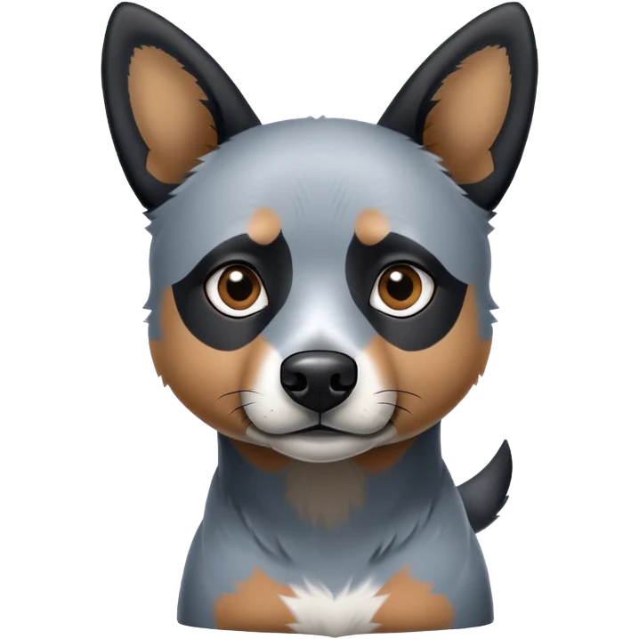 A cute, slightly 3D emoji-style digital illustration of a Blue Heeler (Australian Cattle Dog) from the neck up, with a focus on its face and upper neck. The dog has a black and gray speckled coat with short, dense fur. It has large, pointed ears that stand upright, with the inner part of the ears being a soft pinkish hue. The face is expressive, with warm brown eyes—one eye slightly lazy—giving it a friendly and curious look. The dog’s snout is medium-sized, with a black nose and subtle whisker markings. The expression is neutral but slightly inquisitive. The fur texture should be smooth and well-blended to maintain a polished emoji-style appearance. The illustration should have smooth shading, a rounded, polished look, and a slightly three-dimensional feel. No black spots on the fur. No background. emoji