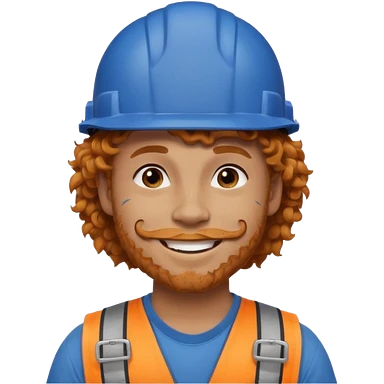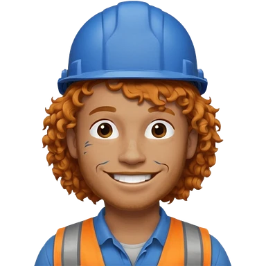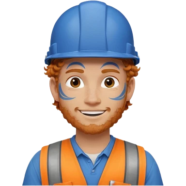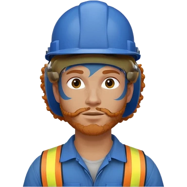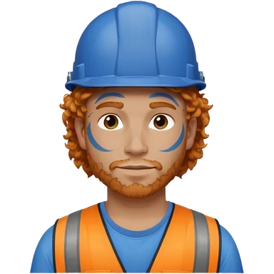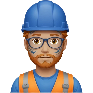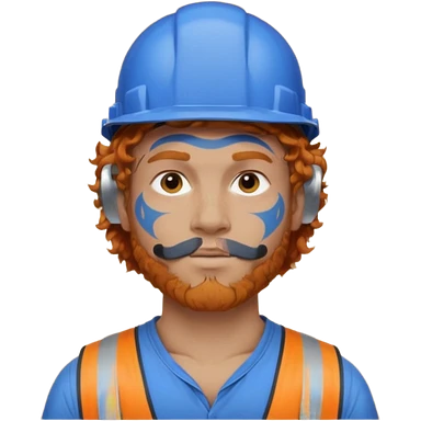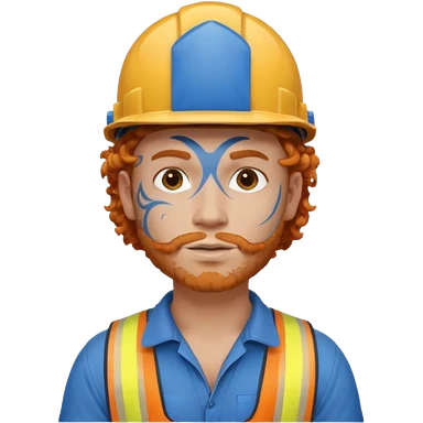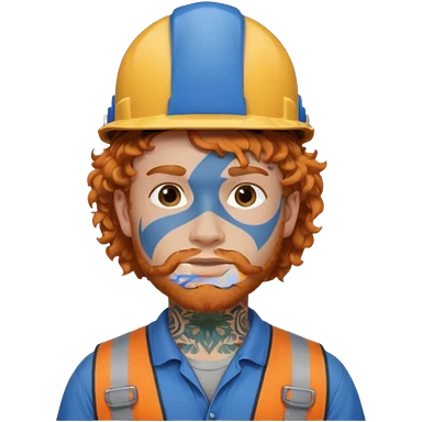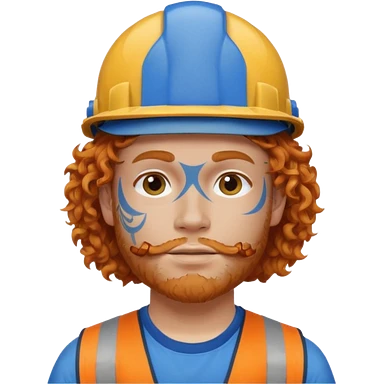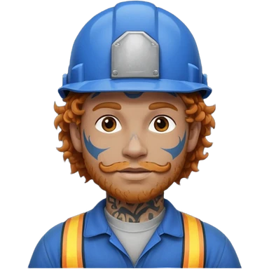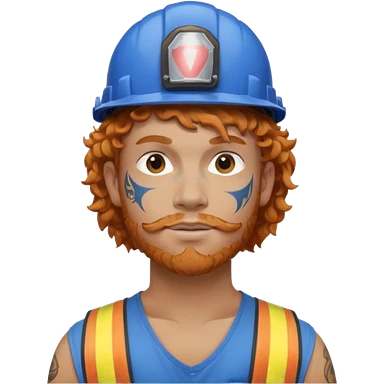 construction worker man ginger curly hair, blue helmet, heavy face tattoo emoji