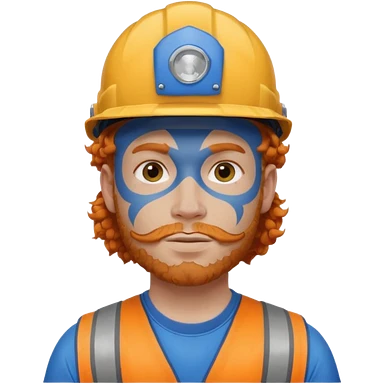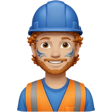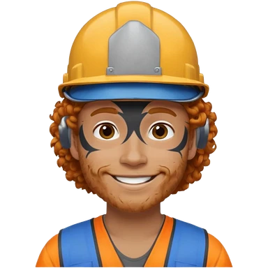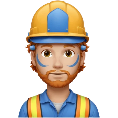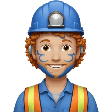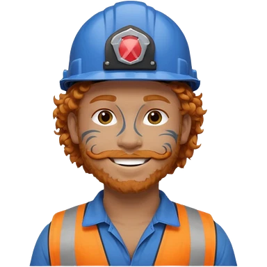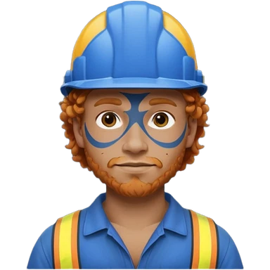 construction worker man ginger curly hair, blue helmet and face tattoo emoji