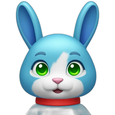 Blue humanoid rabbit with red shorts and white gloves with green eyes emoji
