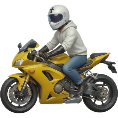 man wearing blue jeans, a white hoodie, black leather gloves, a white crosshelmet with a dark eyes shield and a white mask on a yellow cross motorbike emoji