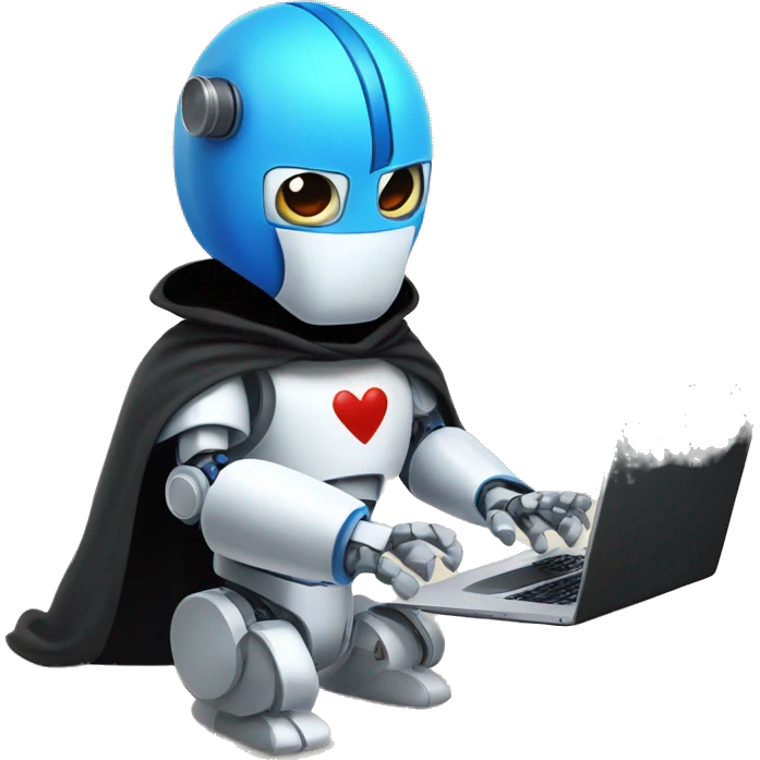 Blue paws, white body, red ears, a robot with a mask over his blue eyes, in a black cloak, holding a laptop and writing something on it emoji | AI Emoji Generator