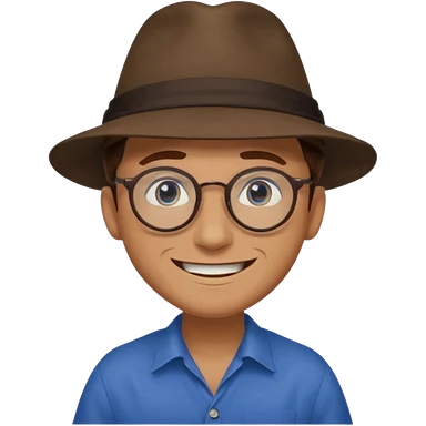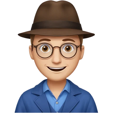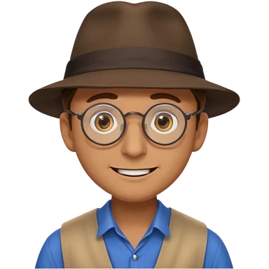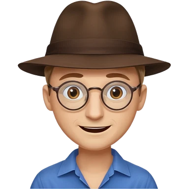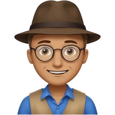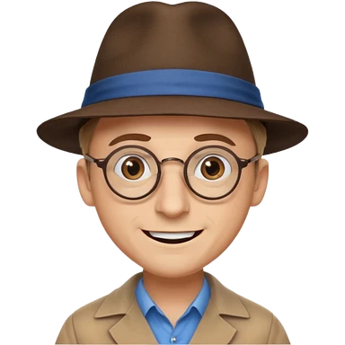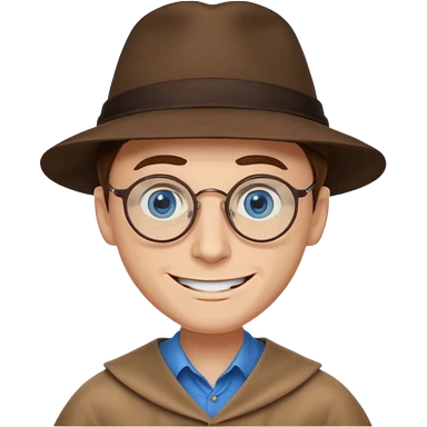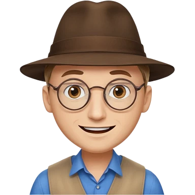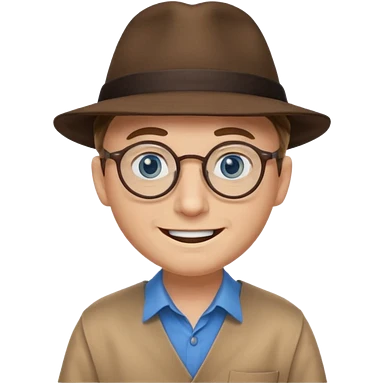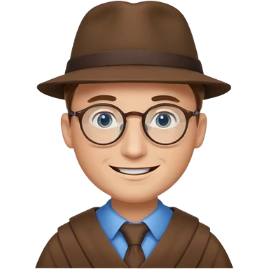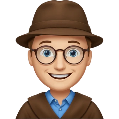 A man with sharp and thin face, brown round glasses, a brown hat and a brown costume (shoulders only), with blue eyes and a large smile on his face. emoji