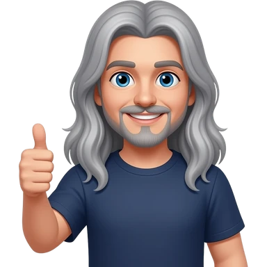 smiling, blue eyes, really long gray hair, mustache, goatee, a dark blue T-shirt with thumbs up emoji