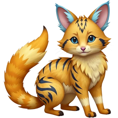 Realistic elegant sunburnt mango-saffron fur shattered by electric sky-blue zigzag scars beautiful elegant pretty precious cute Fakémon-Pokémon-opossum-feline-serval-caracal-chinchilla-Furret-Minccino-hybrid-creature with a big fluffy bushy tail (full body) emoji