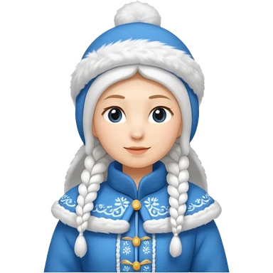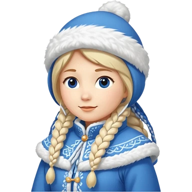 A cute Snow Maiden (Snegurochka) emoji, full body, standing in side view, wearing a traditional blue winter coat with white fur trim, long braid, and a kokoshnik-style winter hat. emoji