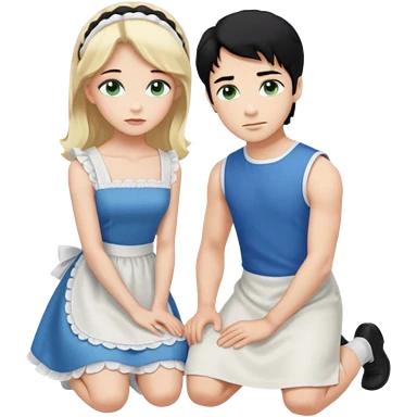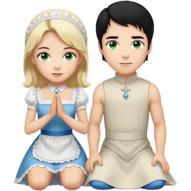 Prince, standing, black hair, blue eyes, and maid, blonde Hair, green eyes, white short sleveless dress, kneeling emoji