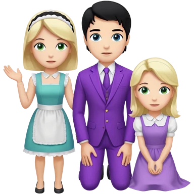 Prince woth crown, standing, black hair, blue eyes, and maid, blonde Hair, green eyes, white short sleveless dress, kneeling emoji