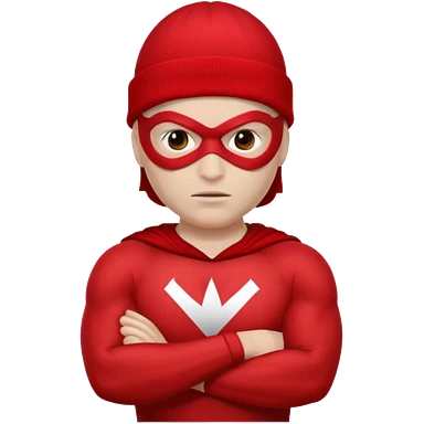 Superhero in red beanie and mask, crossed arms, confident pose. emoji