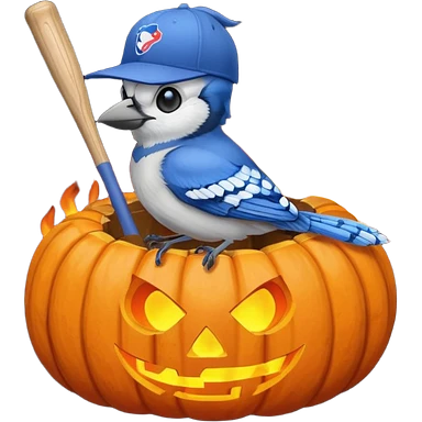 bluejay sitting on scarey Halloween fire inside pumpkin wearing MLB bluejay baseball hat holding a bat emoji