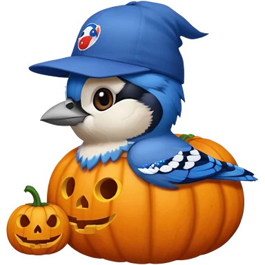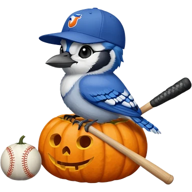 bluejay sitting on Halloween pumpkin wearing bluejay baseball hat holding a bat emoji | AI Emoji Generator