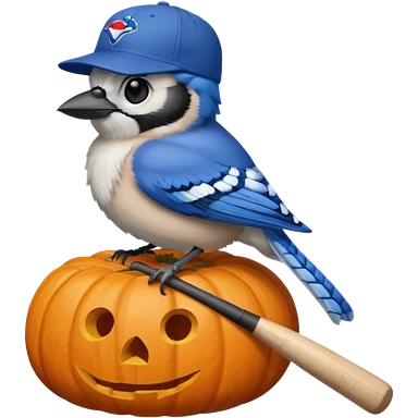 bluejay wearing MLB bluejay baseball hat holding a baseball bat sitting on a Halloween pumpkin emoji