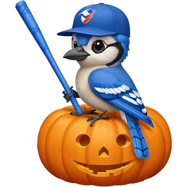 bluejay wearing MLB bluejay baseball hat holding a blue baseball bat, sitting on a Halloween pumpkin emoji