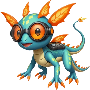 Bluish Splash-patterned emotional sparky sparky boom boom painful Meloetta-Guilmom-Salandit-Flygon-Pokémon-Fakémon-fusion-hybrid-creature with orange goggles on eyes emoji