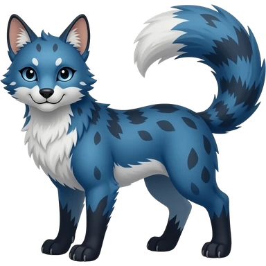 Feral Rare Fantasy scaly evil spooky vibrant dark shady shaded detailed deep-dark-cobalt-blue-gradients-colored colorful Vernid-Sergal-Genet-Trico-Fox-species by LiLaiRa, with dark-blackish points, white belly, random markings, tufted tail, tufted ears, full body emoji