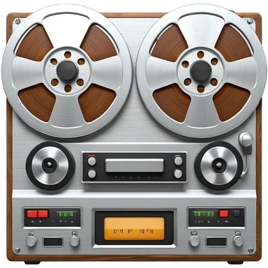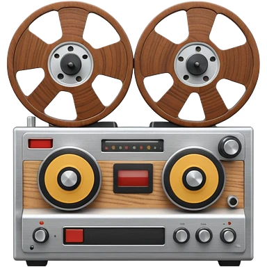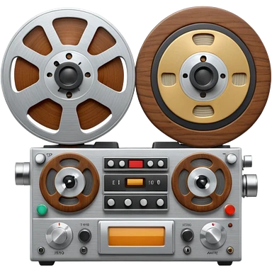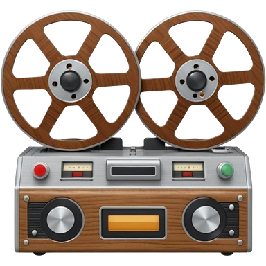 3D render of Reel-to-Reel, vintage 1980s audio equipment aesthetic, tactile analog buttons, silver metallic face with two large brown magnetic tape wheels, mixed wood grain and brushed aluminum textures, Apple emoji style, isolated on white background --v 6.0 emoji