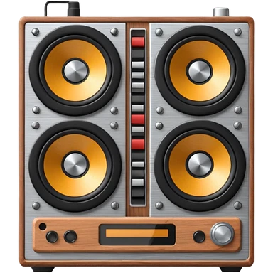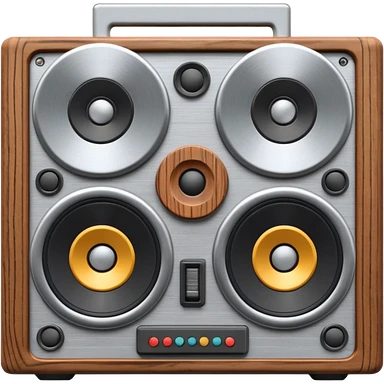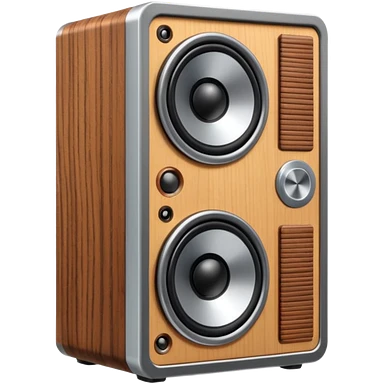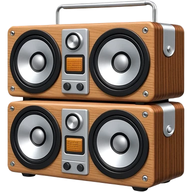 3D render of Speaker Stack, vintage 1980s audio equipment aesthetic, tactile analog buttons, silver metallic face with two large brown magnetic tape wheels, mixed wood grain and brushed aluminum textures, Apple emoji style, isolated on white background --v 6.0 emoji