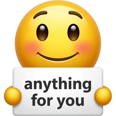 Blushing yellow smiley face holding up a sign that says "anything for you" emoji