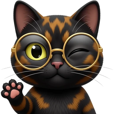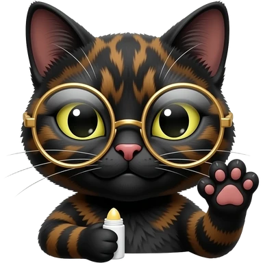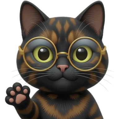 A mostly black Tortoiseshell cat face emoji with a sneaky smirk with round gold glassed and on paw up, with balm up . Only face and cat paw. emoji