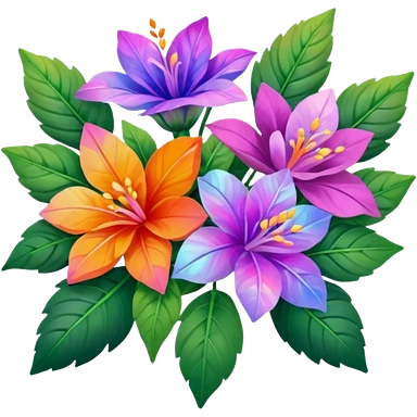 bouquet. resolution of 5000x5800 pixels. transparent background. design should emphasize clean, thin, smooth lines to enhance the visual appeal. Bouquet of lush mixed flowers should be depicted in purple, pink, orange iridescent, holographic, hues. Surround the flowers with realistic leaves, 8k emoji