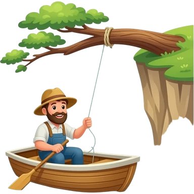 a fisherman in a boat with his line snagged on a tree thats hanging off a cliff emoji