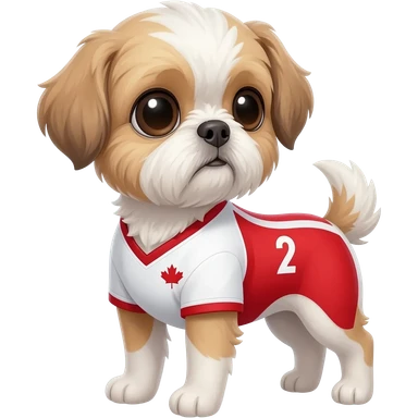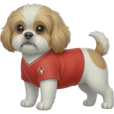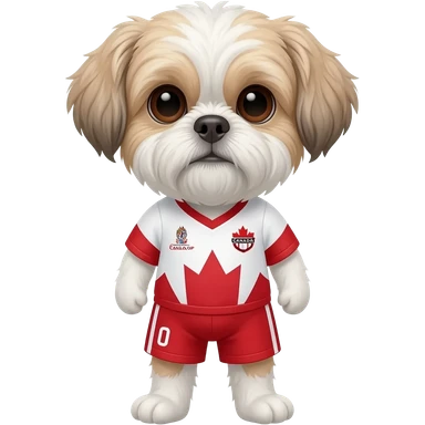 white and light brown shih zhu wearing a Canada white and red soccer jersey v neck 2026 work cup emoji