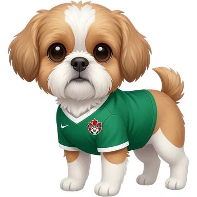 white and light brown shih zhu wearing a Canada green soccer jersey v neck 2026 work cup emoji
