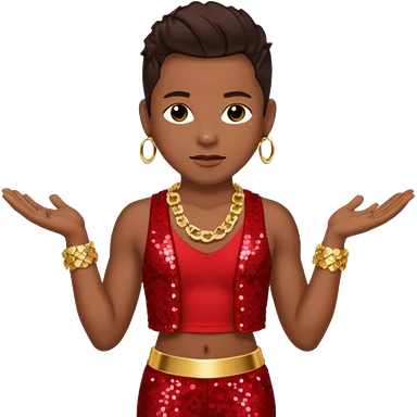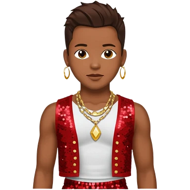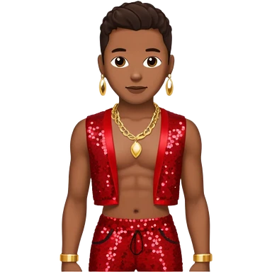 Bobby Brown with dark brown hair, red sequin bolero crop top, red sequin harem pants, shirtless with necklace emoji