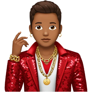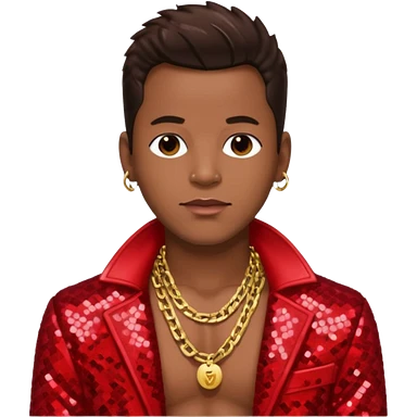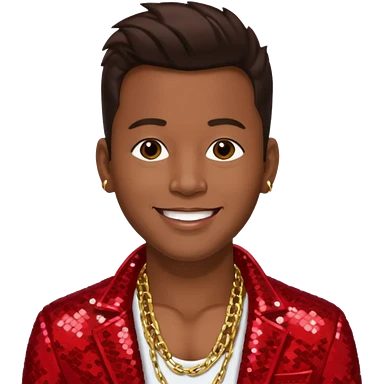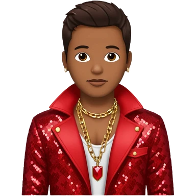 Bobby Brown with dark brown hair, red sequin jacket, shirtless with necklace emoji