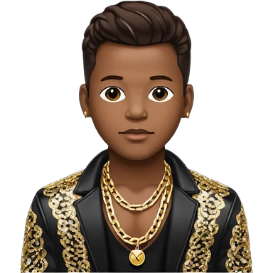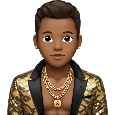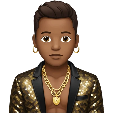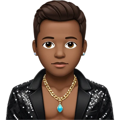 Bobby Brown with dark brown hair, black sequin jacket, shirtless with necklace emoji