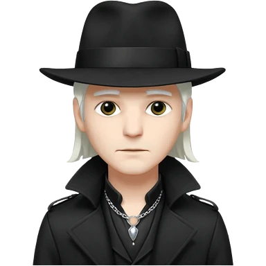 Male Goth with Fedora Sleek long hair, white skin, black trench coat, silver necklace visible under coat, white long hair emoji