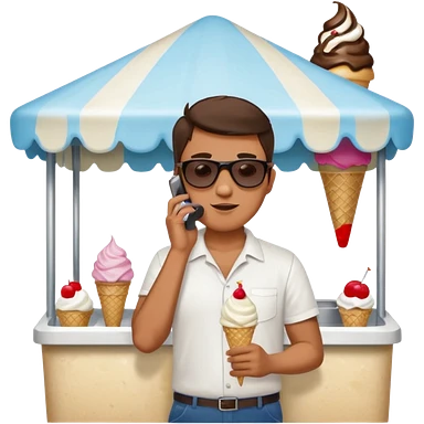 a man standing behind an ice cream stand. he is talking on his phone emoji