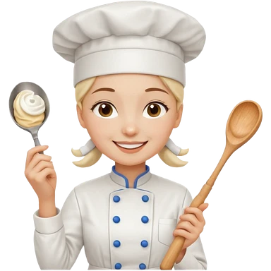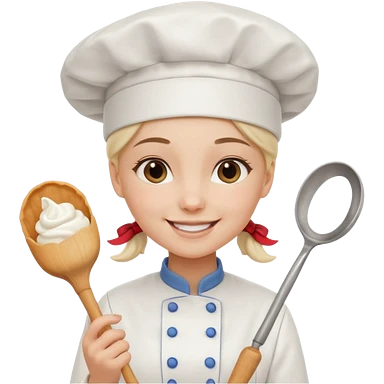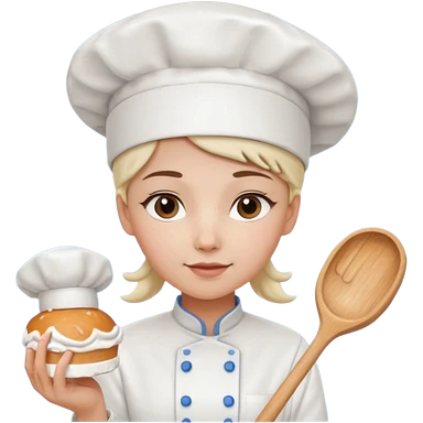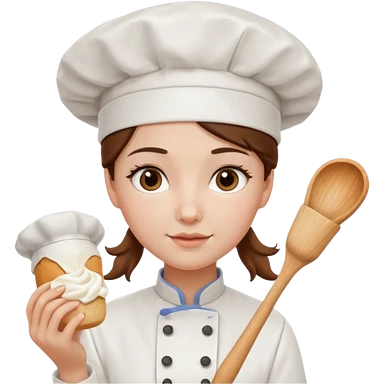 Young female baker – wearing white chef hat, holding a piping bag with cream emoji