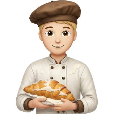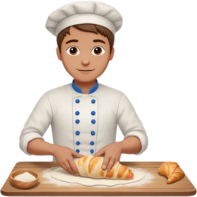 Young male baker – rolling croissant dough on a wooden table, flour on clothes emoji