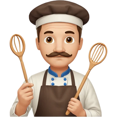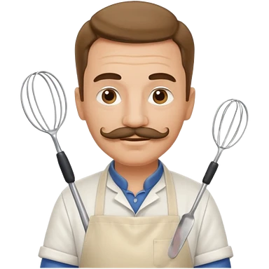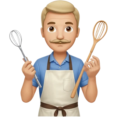 Middle-aged male pastry chef – mustache, wearing apron and whisk in hand emoji