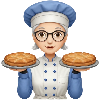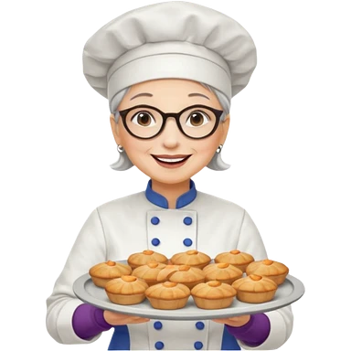 Older female pastry chef – round glasses, oven mitts on, holding a tray of pastries. emoji