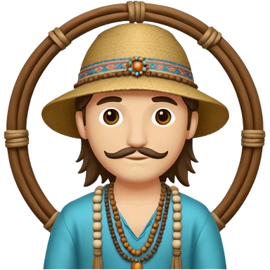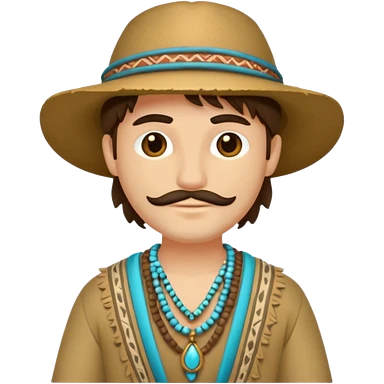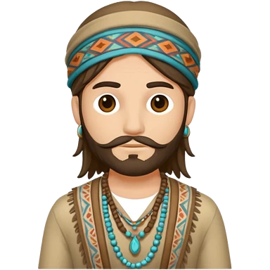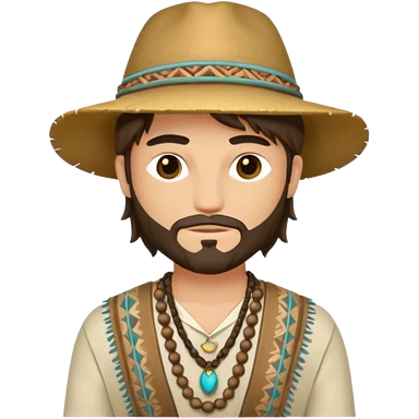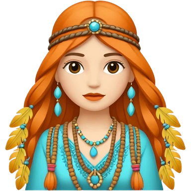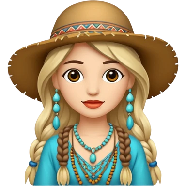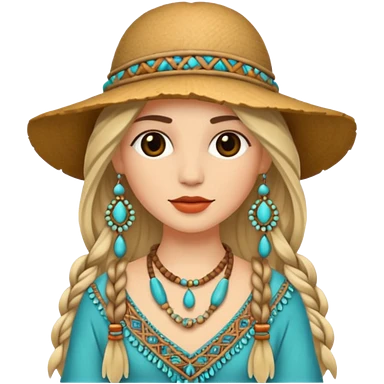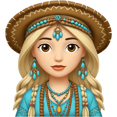 Boho chic fairy with long brown hair and wearing white and earthy tone clothing with blue eyes emoji | AI Emoji Generator