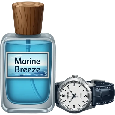 Духи флакон с темно-коричневой крышкой будто бы как попало отрубленной палки или дерева. Флакон длинный с голубой жидкостью внутри и написано морскойбриз. А рядом лежат часы emoji