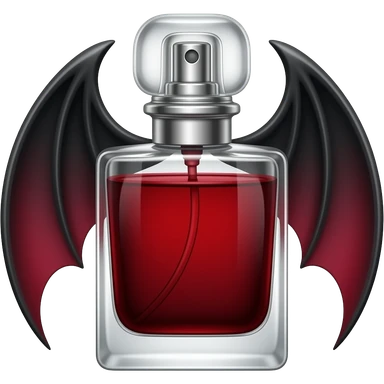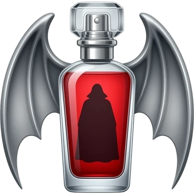 Духи в вампирском стиле с крыльями серебренными детальными обрамляют флакон и красной жидкостью, а на крышке есть элементы двух клыков. Флакон длинный. Высокий. Верх широкий а к низу флакон уже и будто бы в стеклянном флаконе виднеется силуэт сделанный из стекла плаща emoji