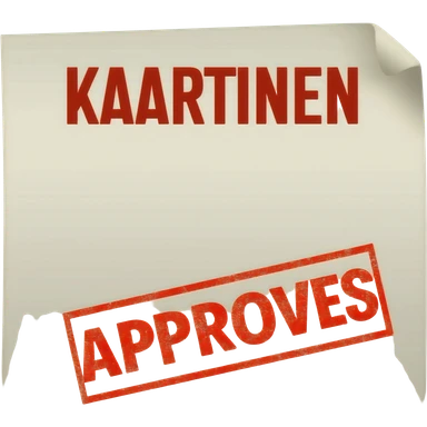 text KAARTINEN and under it red stamp with text APPROVES emoji